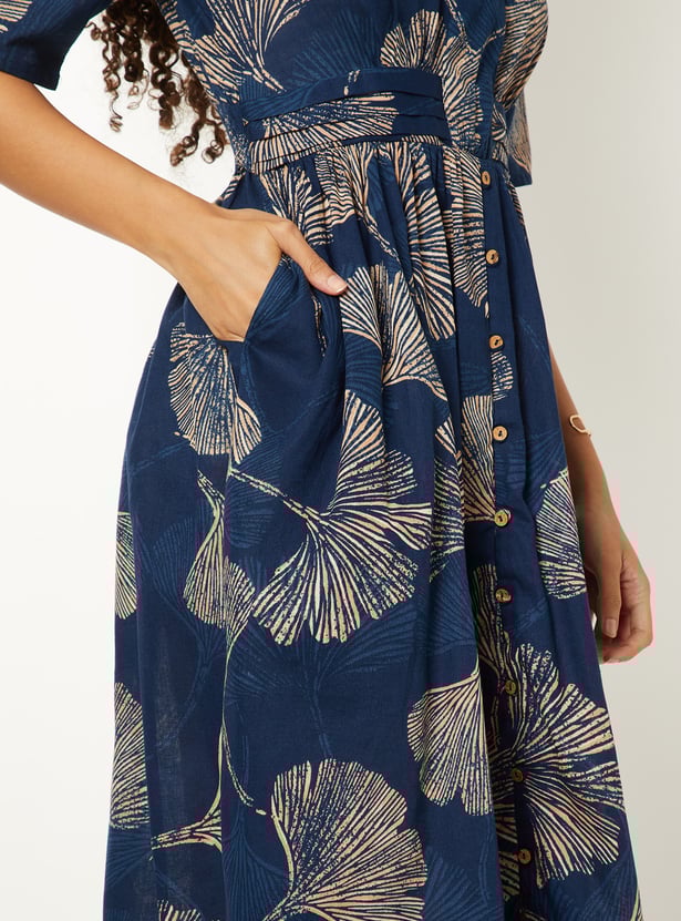 Step out in style with this women’s A-line printed shirt dress featuring a front twist and button-down detail from waist to hem. Equipped with pockets on both sides, a spread collar, and half sleeves, it combines practicality with chic design.